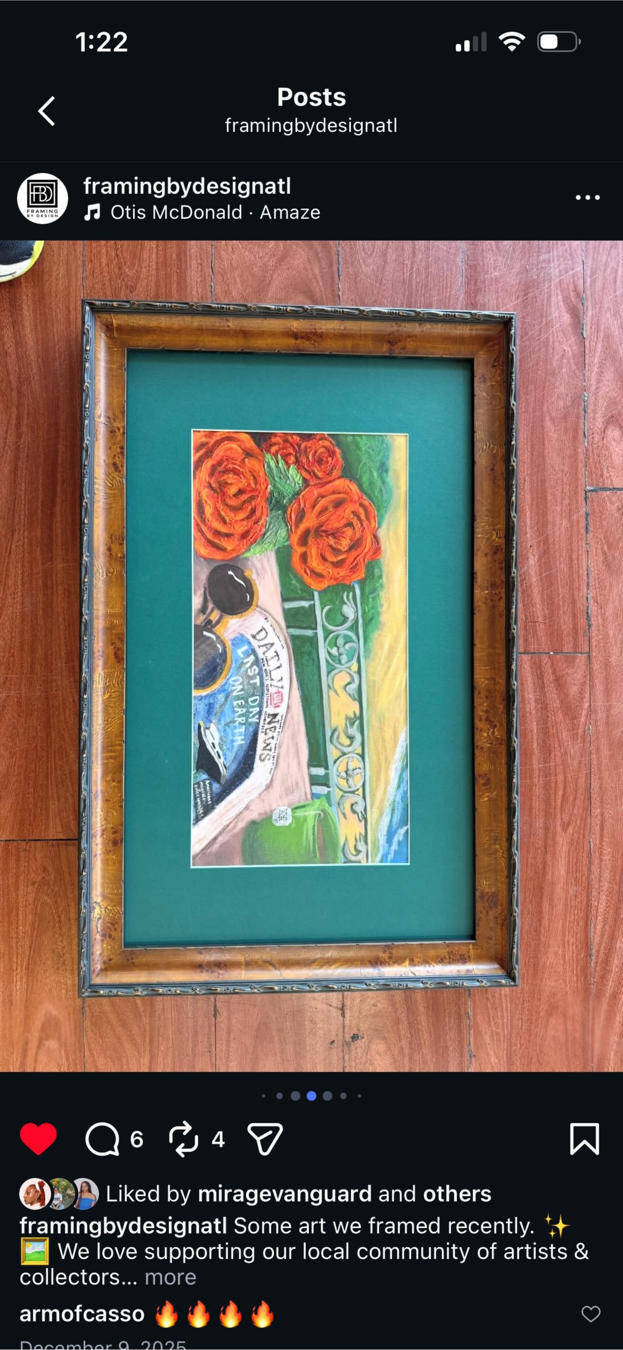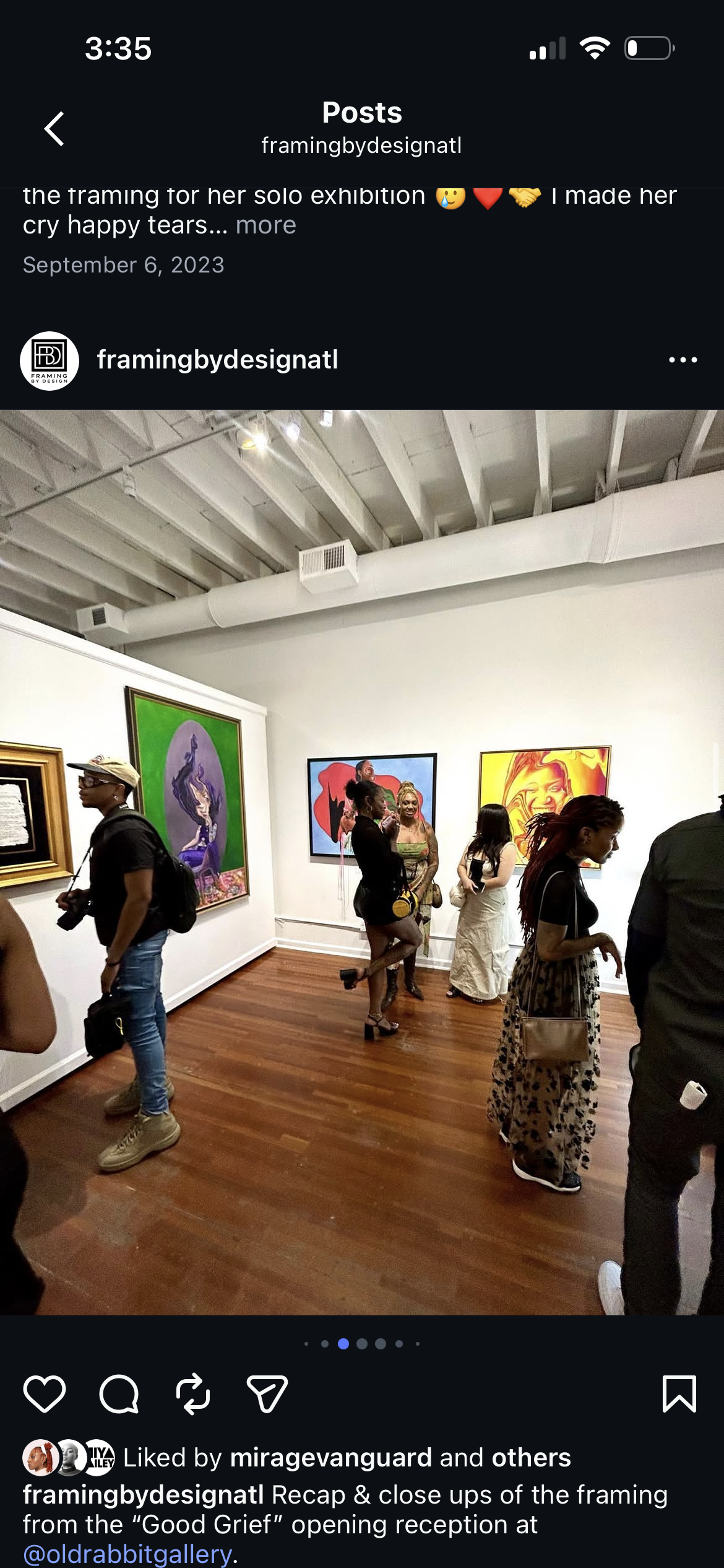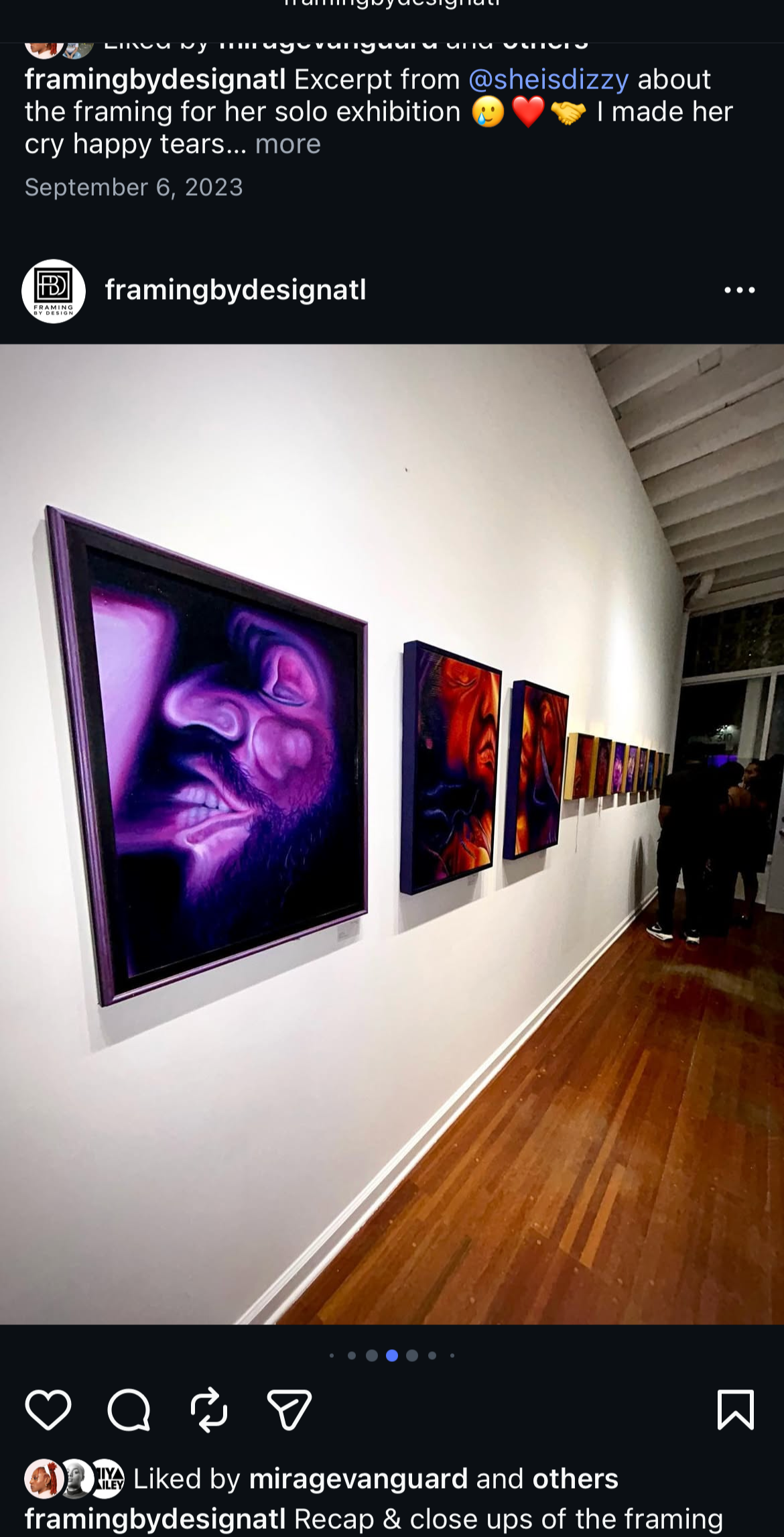 Mirage Vanguard is a celebrated painter whose bold artistic style illuminates the depth, brilliance, and everyday poetry of the black experience. Intentional and culturally rooted, her work commands attention — and so does her craftsmanship. As Lead Framer and COO, she brings over a decade of hands-on framing experience, with a deep understanding of structure, preservation, and scale. She doesn’t just frame art — she composes the final moment before it meets the wall.